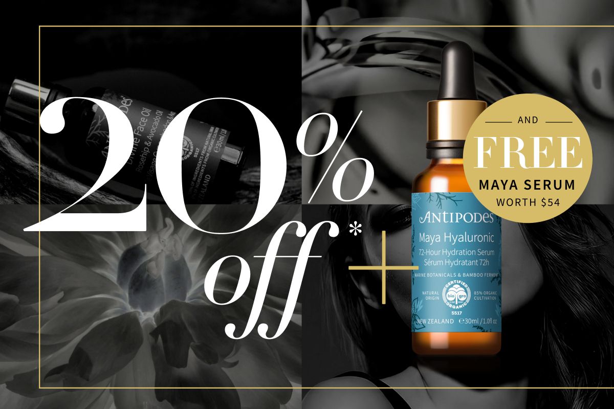 20% off full-size skincare + free Maya Serum* (worth $56)
